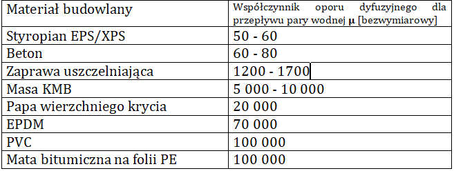 Tabela 1. Współczynniki oporu dyfuzyjnego pary wodnej µ - materiały budowlane. Im niższy współczynnik µ, tym lepszą paroprzepuszczalnością charakteryzuje się hydroizolacja.