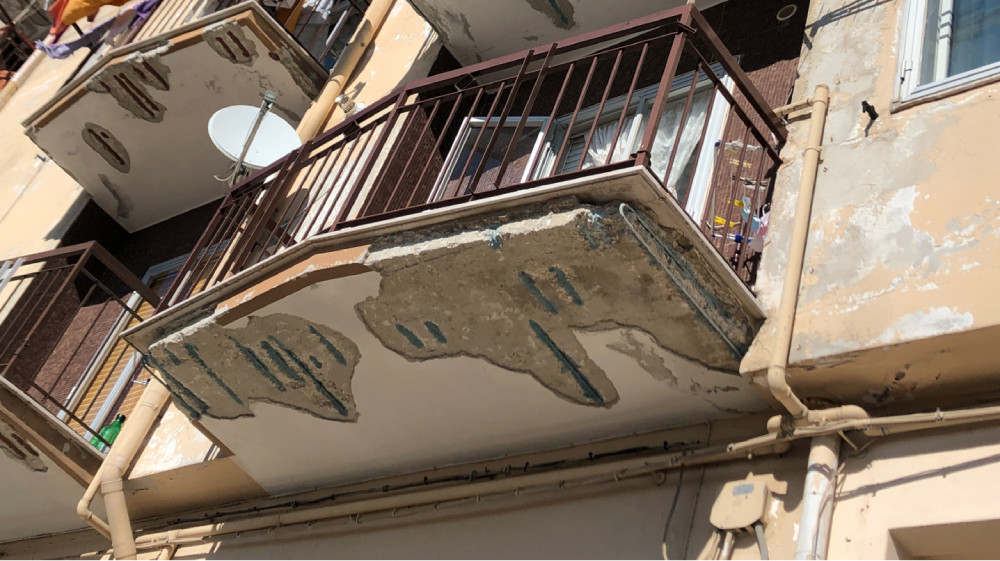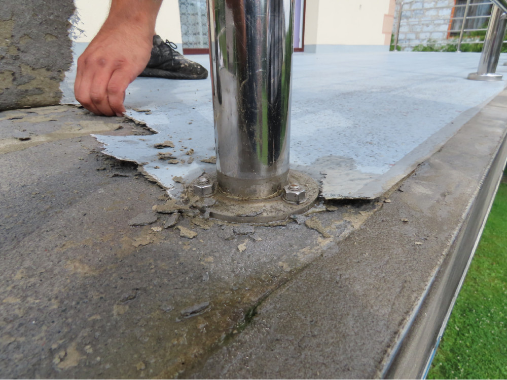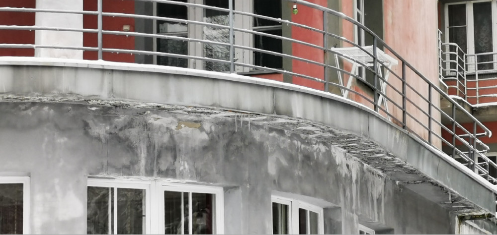 Właściwa hydroizolacja zapewnia ochronę przed destrukcyjnym oddziaływaniem wody, która wnikając w żelbet, może spowodować korozję stalowego zbrojenia i w konsekwencji obniżenie wytrzymałości części, a nawet całej konstrukcji. Długotrwałe oddziaływanie wody oraz dziesiątki cykli rozmarzania i zamrażania występujące w ciągu zaledwie jednego okresu zimowego w naszych warunkach klimatycznych mogą powodować korozję obróbek blacharskich, jak i żelbetu, co może doprowadzić do uszkodzeń początkowo w postaci rys, spękań, odpadania płytek, wykruszania się fug, a w późniejszym okresie do powstawania uszkodzeń i ubytków żelbetu fot. 4. W skrajnych przypadkach mogą doprowadzić nawet do katastrofy budowlanej.
