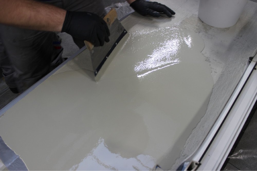 Żywice reaktywne nie wymagają stosowania taśm uszczelniających, lecz w miejscach krytycznych konieczne może być stosowanie siatek lub dedykowanej włókniny zbrojącej, ich zadaniem jest wzmocnienie i zapobieganie pęknięciom fot. 17.