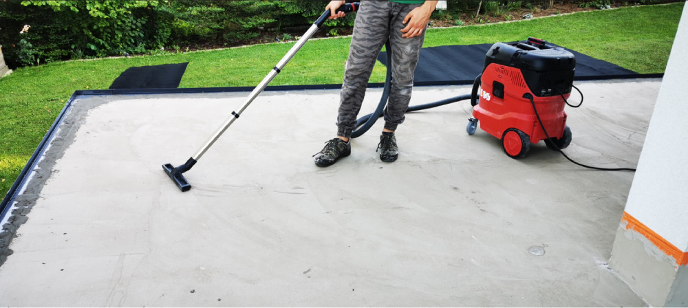 Całą powierzchnię należy oczyścić i dokładnie odkurzyć najlepiej za pomocą przemysłowego odkurzacza, który poradzi sobie z zebraniem pyłu, gruzu piasku itp. z podłoża. Odkurzacze takie dzięki odpowiednim filtrom są odporne na awarie, a dzięki otrząsaczom również nie ulegają zapchaniu w odróżnieniu do odkurzaczy domowych.