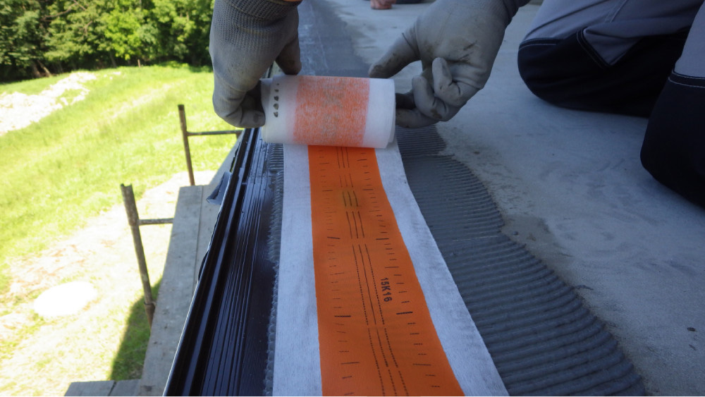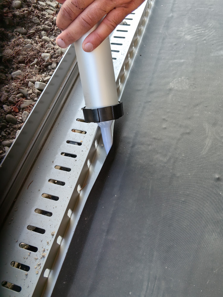 Na przygotowane podłoże w uskoku technologicznym na krawędziach zewnętrznych tarasu montujemy aluminiowe profile okapowe Renoplast. Po zamontowaniu profilów okapowych rozwijamy membranę EPDM z rolki lub rozkładamy zwinięta płachtę i pozostawiamy do wyprostowania zagięć i odprężenia na czas około 60 min. fot. 26.
