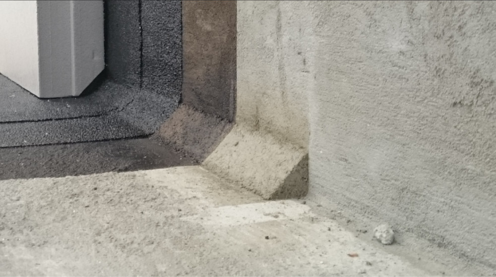 Szczególnym przypadkiem jest papa wierzchniego krycia, która przy wywinięciu na ściany nie powinna być załamywana pod kątem 90°, w tym przypadku bieg krzywej zaginania należy złagodzić poprzez wybolenie lub fasetę fot. 18. Wybolenia lub fasety można wykonać np. z zapraw cementowych, gotowych klinów ze styropapy lub nawet prefabrykowanych fasetowych taśm bitumicznych.