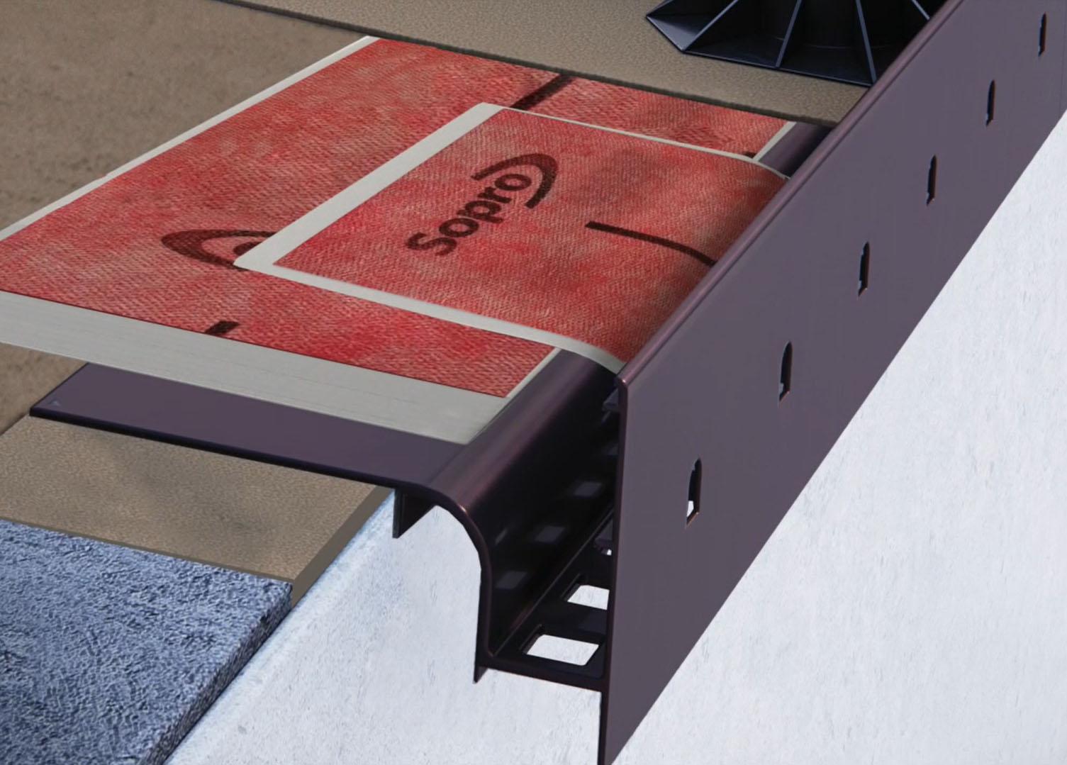 Następnie montujemy narożniki Renoplast NZ W30/90. Narożniki montujemy mechanicznie do podkładu na wcześniej ułożonej masie elastycznej (na przykład poliuretanowej).